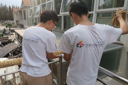 在赵尊组织下,实践团成员两人一组,分段进行麻绳缠绕工作,加快工作效率。实践团成员认真工作,进度可观。18时,麻绳缠绕工作已完成总进度的1/2,达到今日预定工作目标。