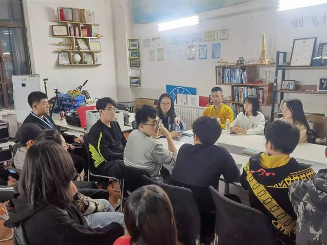 郭岱延向周艳艳详细介绍了社团基本情况。创飞科技协会成立于2018年3月,依托于淄博哇吆创飞智能科技有限公司,并拥有独立实验室。社团包容性强,社团核心成员分布于各个公司,受专业束缚小。社团主要从事业务主要为航拍交流平台、科创类比赛、社会实践、社团品牌活动等。他还进一步介绍了社团部门、公司作用、社团与实验室的运营情况,社团也遇到了报销等发展阻力。