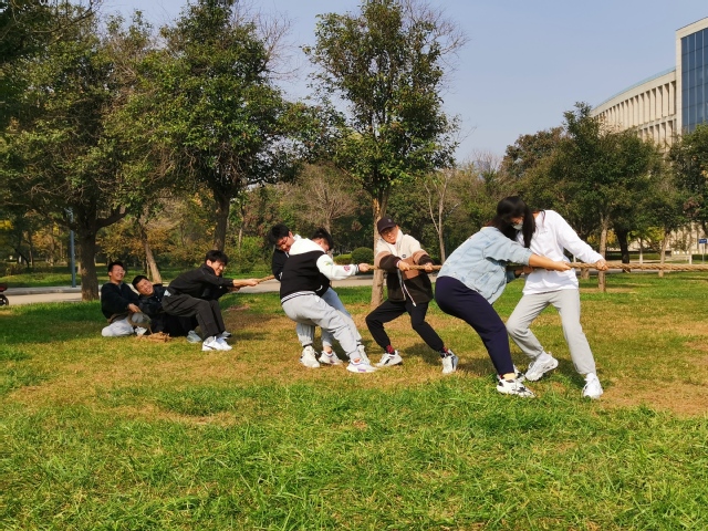 参赛同学率先来到图书馆南草坪进行拔河比赛,并随机分为两组,由孙丰智担任裁判。一声令下,同学们都使出浑身解数,高喊口号,让中线尽量靠近己方。部分同学自发组成啦啦队,加油助威声此起彼伏,场面十分热闹。经过激烈角逐,最终封海清代表队赢得冠军。