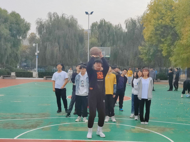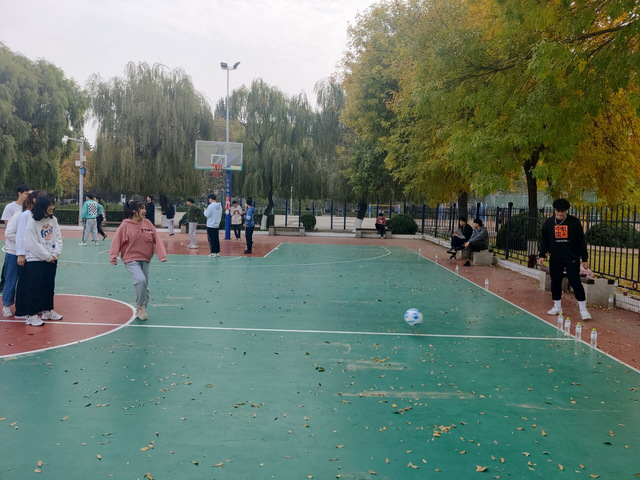 王士铭组织带领全班同学到达第二体育场,此次活动分为四部分,分别是投篮球,踢足球,两人三足,踢毽子。在主持人宣读完规则后,班级活动正式开始。
