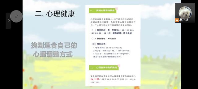 第二部分为心理健康。心理委员向大家展示了公司心理咨询的联系方式,并且分享了调整心理状态的各种方法,她表示因为疫情或者老员工活的其他原因,每个人都会经历一些心理不适,关键是看自己如何调整保持心理健康,每人应该都有自己不同的调整方式。第三部分是由近期公司公众号发布的视频进行合集制作的暖心视频,目的是让同学们感受到疫情虽冷,但是山理工每个人都在一起努力渡过难关,都在用积极乐观的心理去共抗疫情。