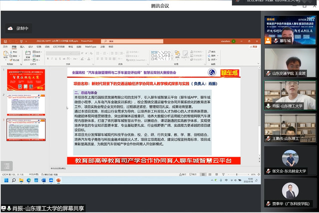 2022年6月18日,教育部产学合作协同育人聊车城项目启动会暨2022年全国高校汽车金融管理师与二手车鉴定评估师智慧云双创大赛开幕式举办。本届大会以“线上+线下”相结合的方式举办,线上通过腾讯会议室参会,并在重庆设立主会场。会议主题为“科技熔铸新金课·实践育人创未来”,会议共邀请来自全国各省市61名高校领导、教师及汽车产业学者、行业专家、名企高管参加。公司教师肖振、刘秉政、王鹏伟代表项目组成员参加了此次大会,共话育人未来,传递时代强音。