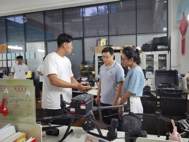 王俊杰向指导老师介绍此次实践的相关设备,他讲到,今年暑期实践所配备的行业机有大疆经纬M300RTK和经纬M200,比去年相比多了一台行业机,在场的消费级无人机有DJI御2和MINI3,其它成员手里还有多种不同型号的飞机,与去年相比较型号更为丰富。他还介绍到,此次配备的负载有禅思XT2、禅思P1和禅思X4S,与此同时还配备有一台无人机地面控制站,能够更好的保证检测的高效性与准确性。