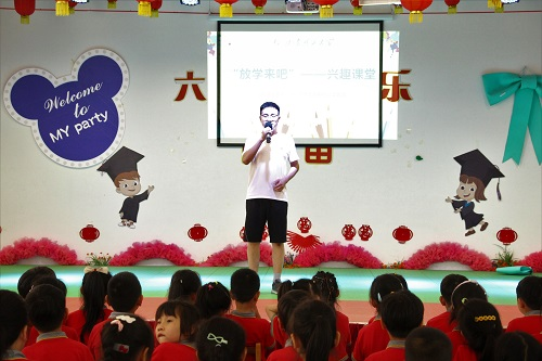 最后,石梁毅带领小朋友学唱《我和我的祖国》和《歌唱祖国》两首爱国主义