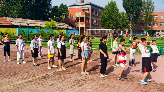 潘子恒将球发给每组第一位同学,讲清游戏规则,球“一上一下”地传递,直到传到最后一个人手上,该成员拿着球跑到队伍的前列继续进行传球,循环到第一位拿球的同学回到队伍最前面即为胜利。