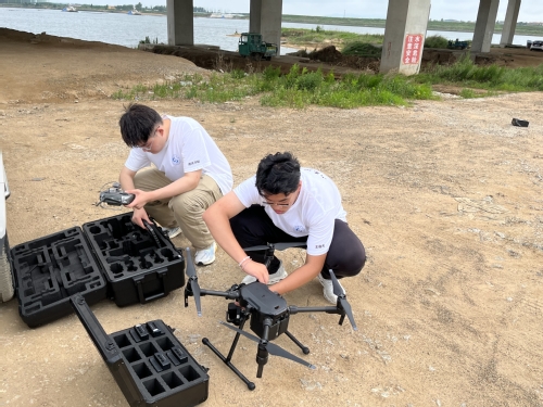 待风速变小后,飞手孙舒鹏启动巡航无人机经纬M300RTK,无人机起飞开始对五龙河大桥的主桥、引桥以及上部、下部结构和桥面系进行外观检测。禅思H20集变焦、广角和激光测距性能于一身,巡检时广角相机首先找出病害存在的宏观位置,激光雷达提供和记录精确的位置信息,进而光学变焦相机得到具体的病害情况。同时经纬M300RTK依靠其强大的视觉系统实现六向环境感知和避障,根据病害位置调节自身姿态。随后无人机返航,队长王俊杰对其更换电池,拆卸原有镜头,重新配备镜头禅思XT2,操控其对桥梁进行热成像扫描,寻找异常温度点并拍照记录。巡检结束后,实践团全体成员合影留念。