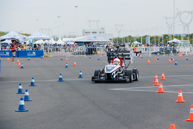 比赛正式开始,至尚方程式赛车以4.37的成绩成功位列直线加速第五名,获得了“TOP 10”的标识。接下来的高速避障项目,由于车手对于新赛道的布局不太熟悉,第一次跑动因撞上桩桶而取消成绩。在剩余的3次跑动中,车手们为确保取得成绩,采用较为保守的跑法,并最终取得单圈最快圈速1分20秒的成绩。