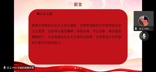 会议伊始,王猛同志从党的二十大大会主题引入,带领全体党员共同学习党的二十大精神第一部分——习近平总书记在党的二十大报告中提出了一系列重要论断。王猛同志从三个“务必”、十年来三件大事、中国共产党的中心任务和中国式现代化的本质要求、把握五大原则以及五个“必由之路”这五个方面展开学习。全体党员深入学习贯彻党的二十大精神,深入学习领会习近平总书记重要讲话精神,全面推进中华民族伟大复兴。