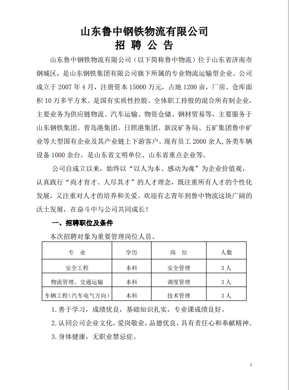 山东鲁中钢铁物流有限公司招聘(交通运输、车辆工程)