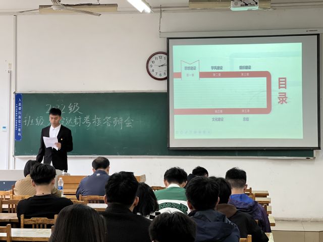 答辩会分为PPT汇报和现场提问两个环节。各班答辩人采用PPT对班级建设情况进行汇报,他们围绕思想建设、组织建设、文化建设、学风建设等方面全面总结了班级在过去一学期开展的主要工作,畅谈工作经验和举措,分享工作成绩和问题困难,并对新学期的工作进行展望。与会评委老师结合各班级日常表现,与班级答辩人深入交流,有针对性的指出了各班级在建设过程中的亮点及存在的问题,并提出建议与方法。在场的其他班委不时记录,互相交流与学习其他班级的先进经验,反思自己在班级建设中存在的不足,取长补短,更好地带动班级积极向上发展。