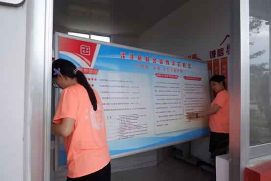 7月11日下午,bevictor伟德“向阳花开”社会实践团与洼子村村委干部们一同整理村庄宣传栏板块,实践团成员在整理时询问村委干部宣传板上重点内容,调研洼子村治理理念及治理体系。