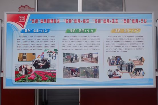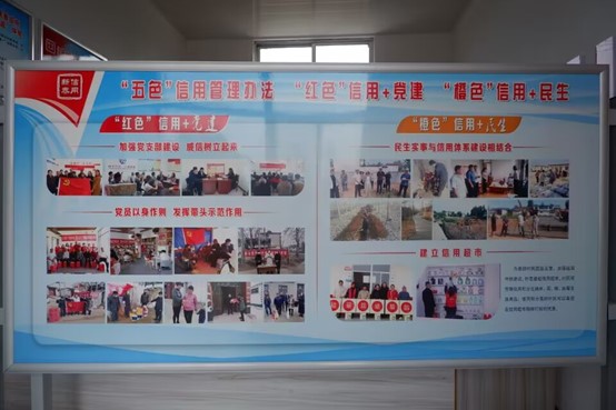 洼子村宣传栏重点标明信用体系建设,大力宣传进一步推进美德山东和信用山东建设工作,贯彻落实社会信用体系具体要求,积极响应新泰市政策,推出五色信用体系,建成公平诚信村庄。