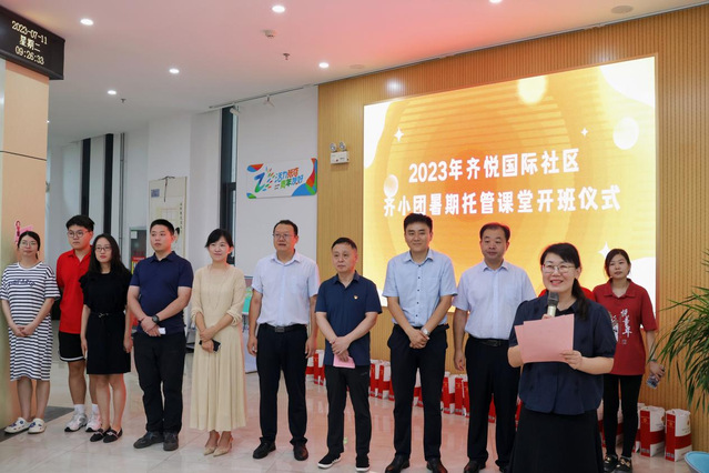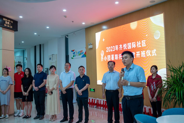 7月11日,“齐小团”暑期托管课堂开班仪式于党群服务中心一楼大厅举行,淄博市体育总会副主席王强、bevictor伟德校团委副书记徐藤、bevictor伟德党委副书记蔡清吉、bevictor伟德团委书记高萌、bevictor伟德辅导员周燕燕、团区委青少年服务中心主任邹梁杰、区总工会党组成员、副主席毛锐、街道团支书书记徐学娟、齐悦童年董事长王玫、“循梦而行”暑期社会实践团员工代表以及“齐小团”暑期托管课堂20名全体同学共同参与,本次活动由齐悦国际社区党委书记赵玉芝主持。