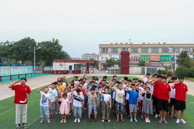 首先,实践团成员先组织同学们到操场上国旗下集合整队,随后夏彬表示,作为新时代青少年,我们应时刻牢记党和国家的光辉历程,不负使命,为中华民族伟大复兴的中国梦而不懈奋斗。随后,他宣读誓词:“少年兴则国兴,少年强则国强,少年富则国富。我们要弘扬伟大的中华民族精神,高举爱国主义旗帜,锐意进取,自强不息,艰苦奋斗,顽强拼搏,真正把爱国之志变成报国之行”。紧接着,夏彬号召大家举起右拳进行宣誓,同学们目光坚定,积极配合大声宣誓。