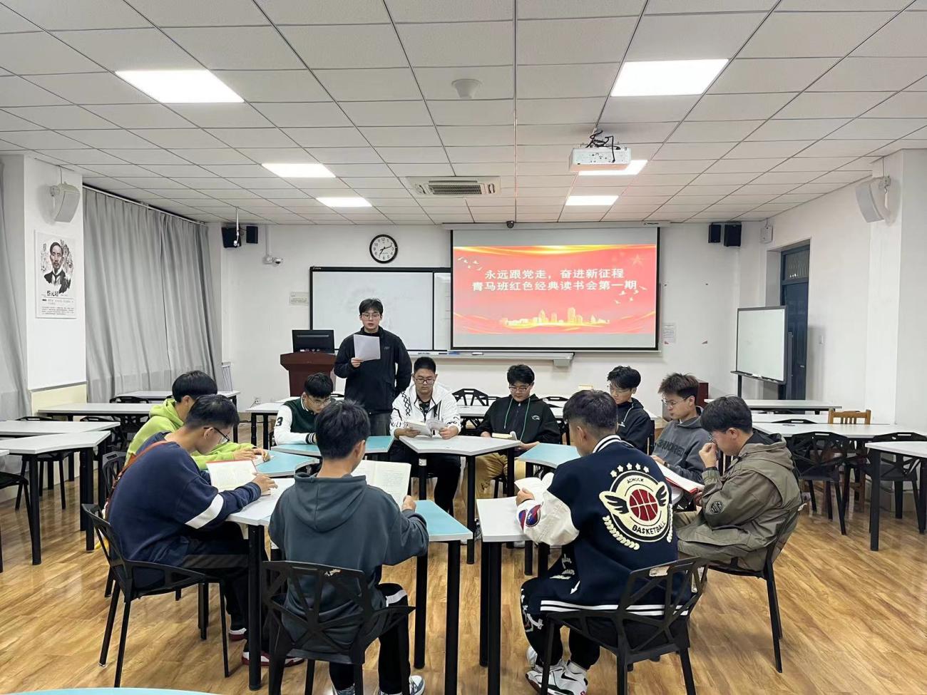 青马班代表庞继瑞起立朗读经典文章,并与其他成员分享自己的阅读心得和感悟,与大家共同学习优秀党员的精神和品格,增强先锋模范意识。在听完庞继瑞的感悟之后,其他成员 纷纷积极发言,结合自己阅读的书籍与其它同学展开讨论,进行思想碰撞,青马班成员们的分享注重理论与实践紧密结合,突出深学实干。