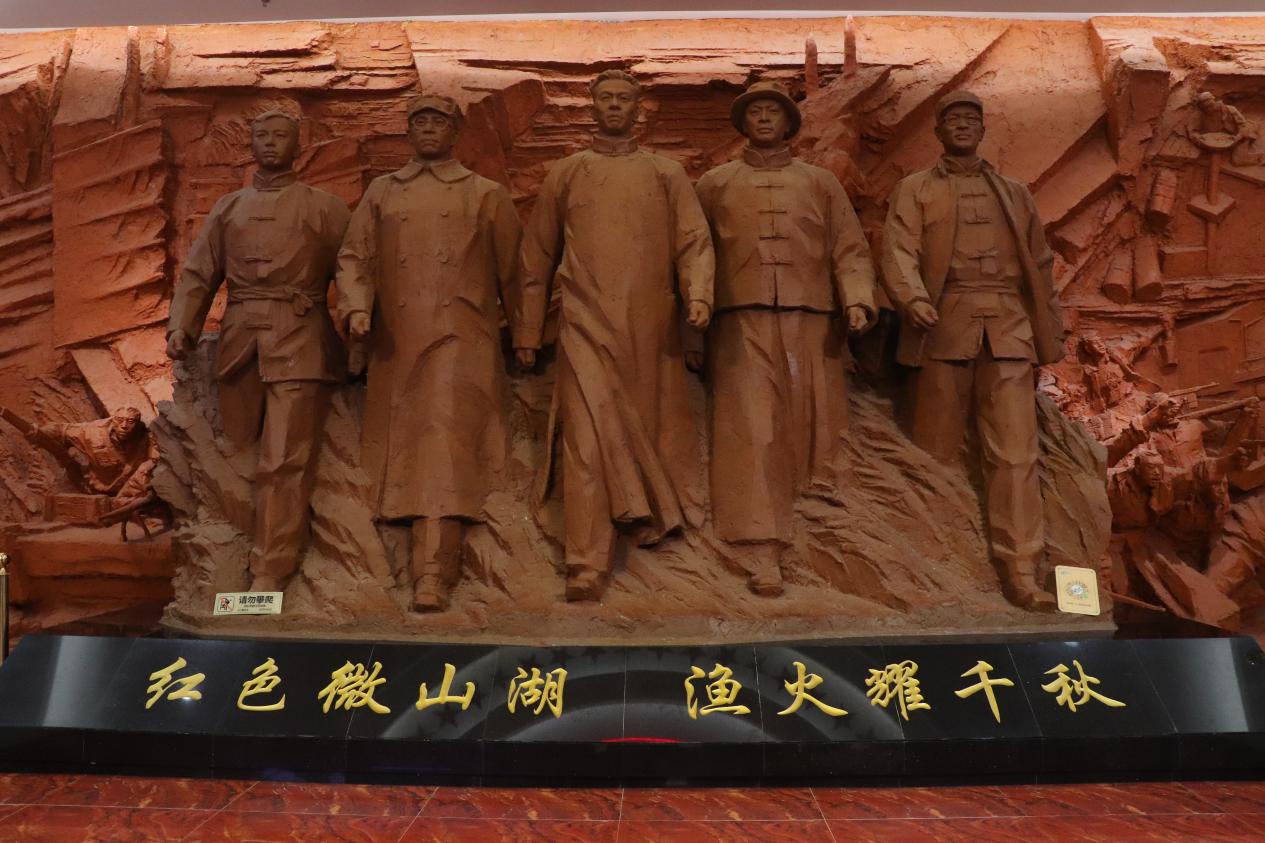 抵达微山岛后,实践团成员们首先来到了铁道游击队纪念馆。步入纪念馆,首先映入眼帘的是南面墙上五位领导人的雕塑及其他们脚下“红色微山湖,渔火耀千秋”几个大字,它仿佛在诉说着那段不朽的历史,引领着每一位参观者穿越时空,回到那个烽火连天的年代。