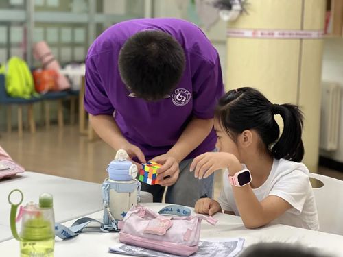 在紧张又充满挑战的10分钟过后,实践团成员分别辅导各个组的小朋友,将此次拼凑进行详细地讲解,让未完成的拼凑过程得以继续。在课余时间,小朋友们积极询问实践团成员关于魔方的知识,以及一些魔方技巧,许多小朋友都表现出了对魔方浓厚的兴趣。还有一些对魔方很熟悉的小朋友,跟实践团成员比拼拼魔方的速度。实践团成员与小朋友们其乐融融,比拼激烈,共同完成了此次课堂的教学。