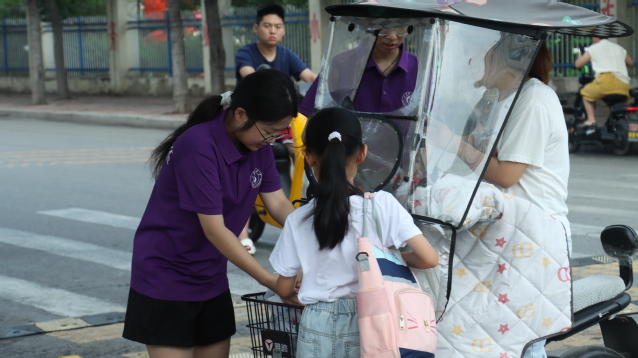 上午八点,实践团成员便早已在公司周边的主要路口就位。看到骑电动车送孩子的家长靠近,他们立刻上前协助:有的稳稳扶住车把,有的轻声引导孩子下车,还有的顺手接过沉甸甸的书包。简单的互动里满是信任与暖意,为孩子们的上学路筑起了一道安全防线。