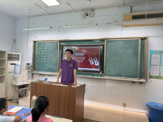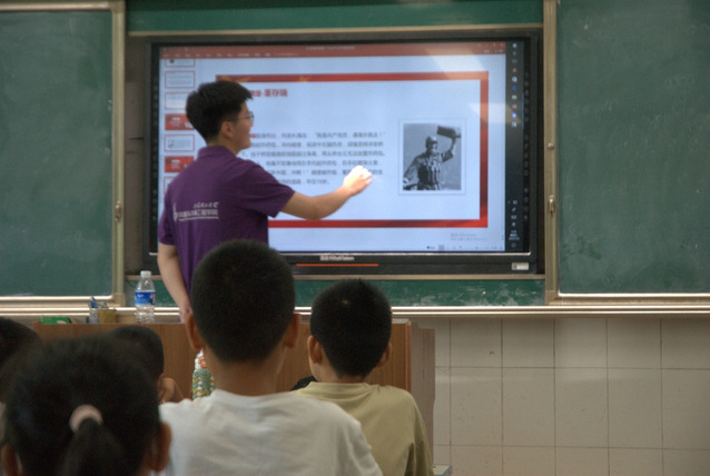课堂里,实践团成员们以图文的形式向孩子们介绍了多位革命英雄。在向孩子们展示革命先烈英勇奋战的相关红色视频时,炮火掀起的尘土填满视野,冲锋号的声波在教室里回荡,视频的光束映在每张稚嫩的脸上,照出微微颤抖的嘴角和攥紧的手心。一幕幕英勇的画面,在孩子们心里凝成一条滚烫的血脉,使他们对革命先烈更加崇敬。