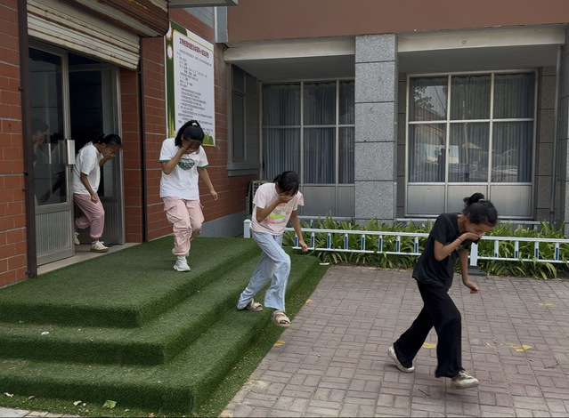 伴随着急促的警报声响起,消防演练拉开了序幕。在听到广播“现在进行消防演练,请同学们在老师的指挥下立即疏散”后,孩子们弯腰低头、捂住口鼻,有序向教室外的应急疏散地点跑去。实践团成员在确保教学楼内员工全部疏散后,再到达集合地点,实践团成员们迅速清点各班人数,并向实践团队长和公司领导统一汇报。