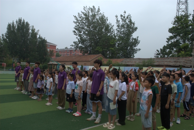 周一的清晨,实践团成员与明德小学的孩子们齐聚操场,在雄壮的《义勇军进行曲》中共同见证五星红旗冉冉升起的庄严时刻。在国旗的见证下,全体实践团成员与同学们将以更加昂扬的姿态,在新时代的征程上携手同行,共同书写青春华章。