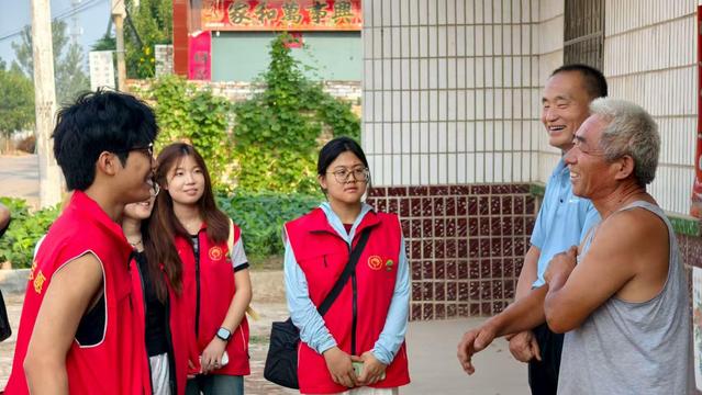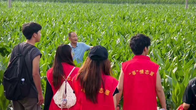 实践团的成员们踩着田埂上的软泥,钻进绿油油的地里。有的蹲下来扒开叶子看看庄稼长得好不好,有的拿着本子写写画画,记着这是啥品种、种了多大一片、从种下到能收要多久。田边的树荫下,几个村民正和他们唠着家常。大爷指着地里的苗说:“前阵子虫子多,叶子被咬得坑坑洼洼,急得睡不着觉。”大妈也凑过来:“天旱的时候浇水得一趟趟挑,累不说,还怕浇不匀。”成员们听得认真,时不时点点头,把这些话也记在本子上,脸上满是仔细的样子。