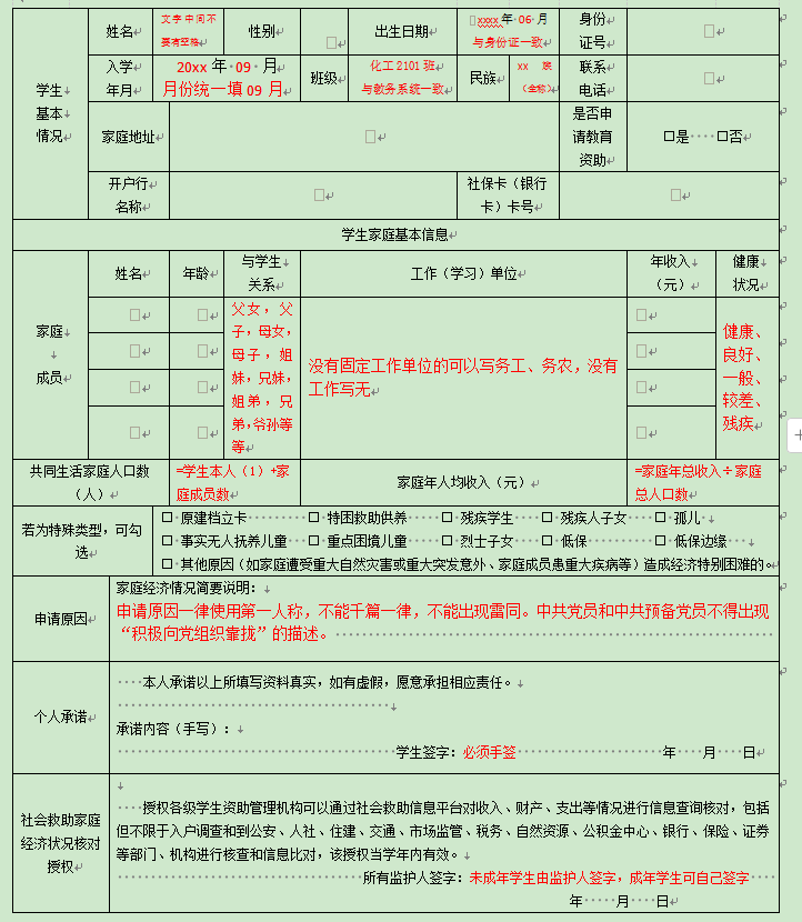 2. 《山东省高等教育资助申请表》填写模板